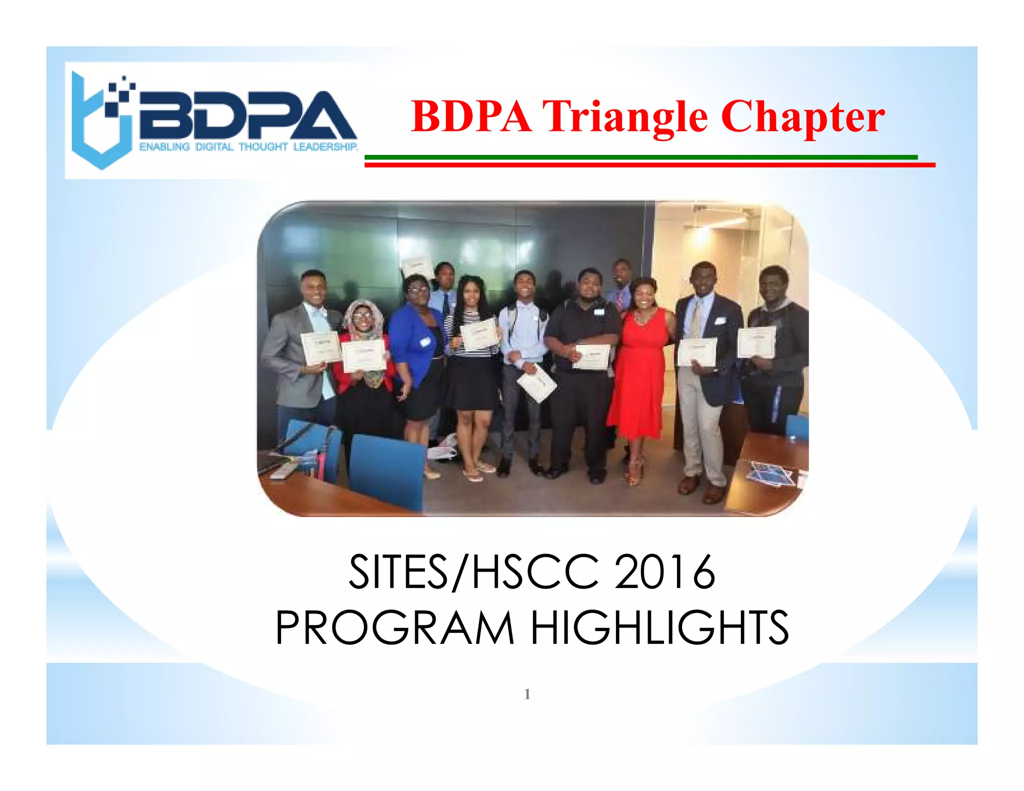 The BDPA Triangle Chapter launched its technology academy on March 5, 2016, providing 20 students with essential internet technology skills over 12 weeks, culminating in competitions at regional and national levels. The students gained insights from industry leaders, including keynote speaker Monica Cutno, founder of Envision Science Academy, during the program's closing ceremony. Since its inception in 2009, the program has maintained a 100% graduation rate, with all students entering college in STEM disciplines.