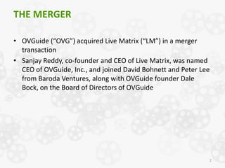 The document summarizes the merger between OVGuide and Live Matrix to create a comprehensive source for online video discovery and guidance. Key points: