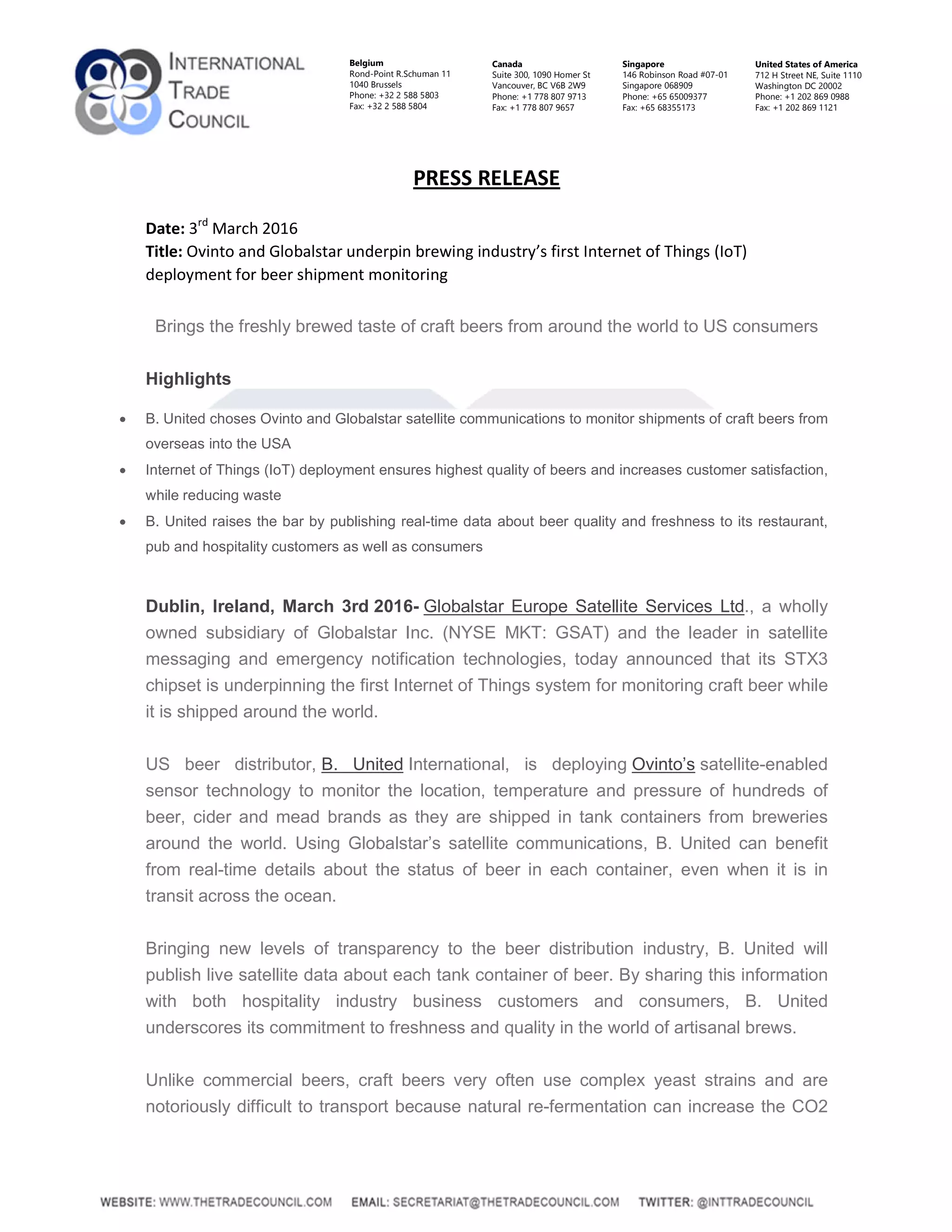 B. United International is deploying Ovinto and Globalstar's satellite technology to monitor craft beer shipments to the U.S., ensuring high-quality and freshness during transit. This Internet of Things (IoT) system provides real-time data on the beer's location, temperature, and pressure, minimizing waste and enhancing customer satisfaction. The pilot program has already shown success, and full deployment is expected by spring 2016.