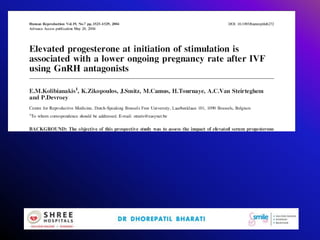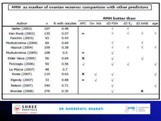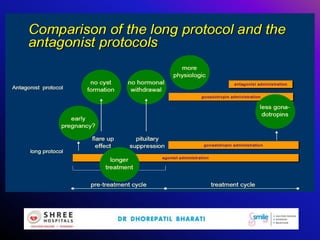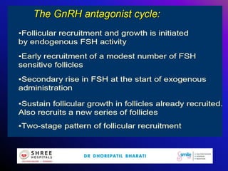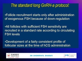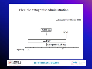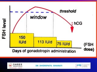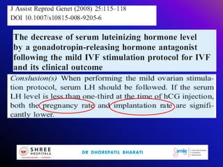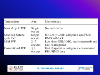 This document discusses mild ovarian stimulation protocols for ovulation induction and in vitro fertilization (IVF). It outlines important factors to consider like ovarian reserve, previous response, and hormone profiles. It compares protocols using clomiphene citrate, aromatase inhibitors, and gonadotropins alone or in combination to induce ovulation of 1-3 follicles. Premature luteinization during ovarian stimulation is also discussed. The document aims to develop cost-effective low-dose IVF procedures suitable for developing countries like India.