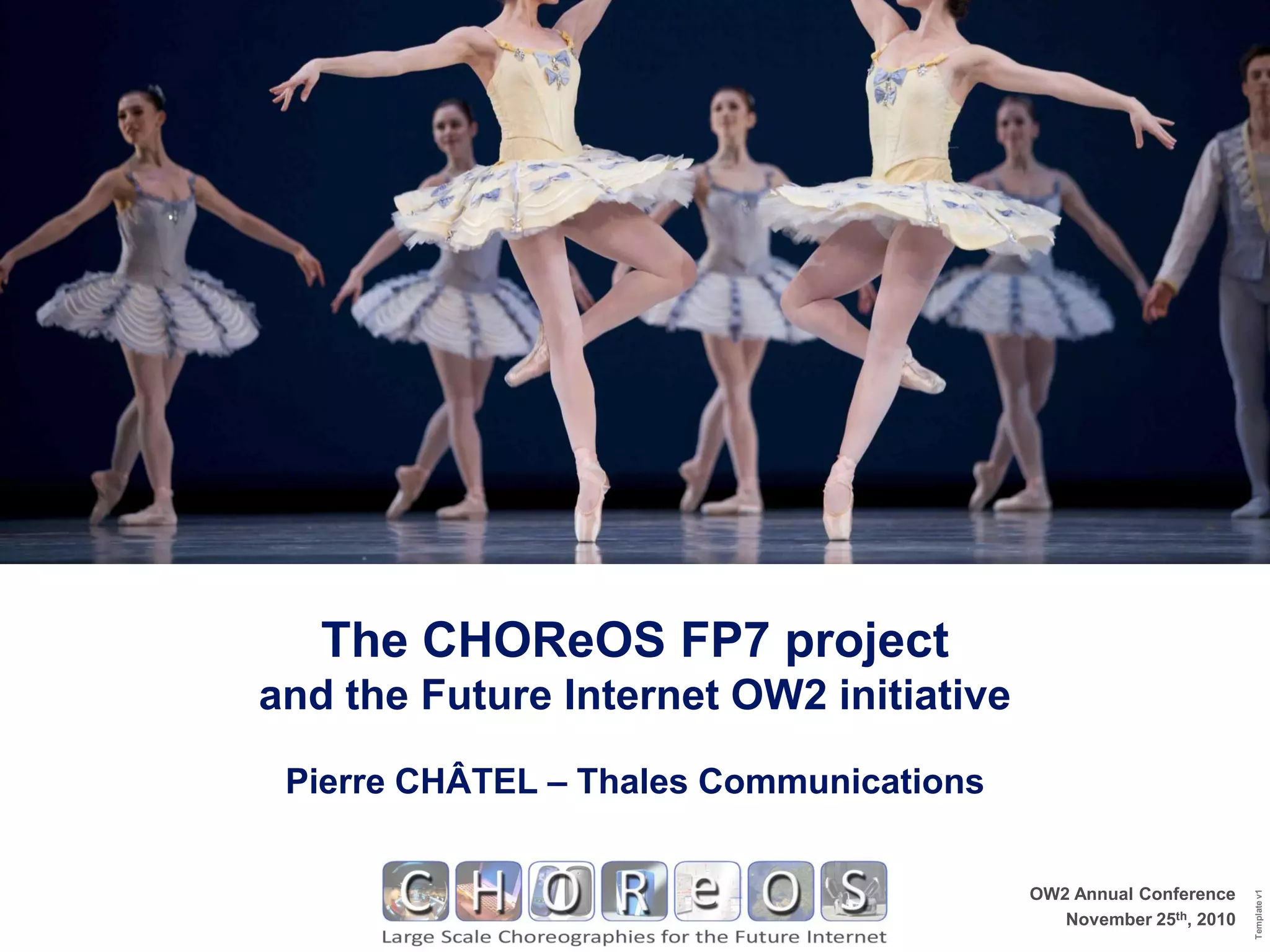 The CHOReOS project aims to develop choreographies for ultra-large scale service coordination in the future internet. It introduces a dynamic development process and middleware to implement and coordinate decentralized services through choreographies. The project is an FP7 initiative with 15 partners and a budget of 8.6 million euros. It seeks to address challenges of heterogeneity, scalability, and distribution in future internet architectures through a choreography-centric approach.