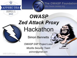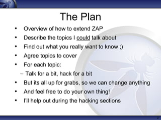 The document provides an overview of a hackathon being led by Simon Bennetts on extending the OWASP Zed Attack Proxy (ZAP) tool. The plan is to give an overview of how to extend ZAP, discuss potential topics to cover such as implementing scripts, scan rules, and extensions, and then have hands-on hacking sessions with assistance from Simon. Simon outlines many possible topics for discussion, including the ZAP project structure, development environment, documentation, scripting, active and passive scan rules, extensions, and features or fixes to work on.