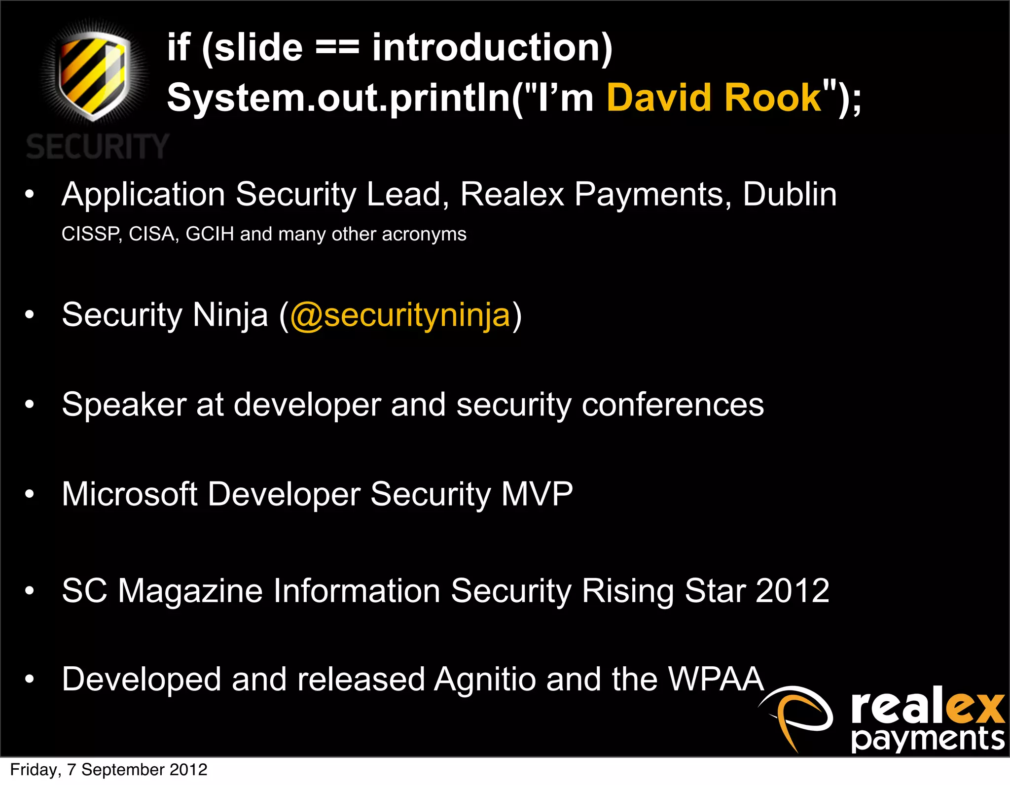 David Rook presented on Windows Phone 7 security. He began by providing context on the growing smartphone market and Microsoft's small market share. He then discussed the Windows Phone 7 platform security model, which uses chambers to enforce app isolation and least privilege. Rook also covered Windows Phone 7 application security best practices, emphasizing the importance of secure storage, authentication and authorization, and secure access to personal data. He concluded by briefly discussing new security aspects of Windows Phone 8.