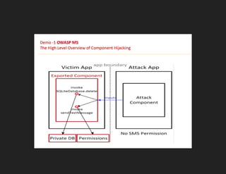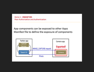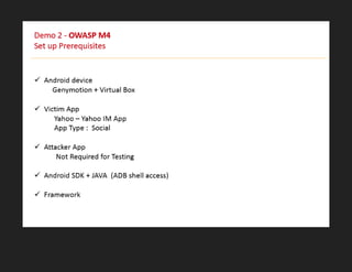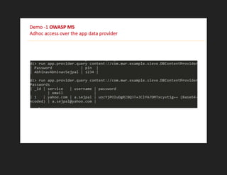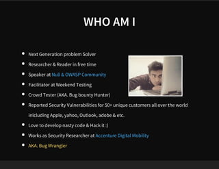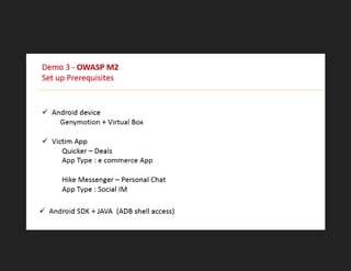 The document features Abhinav Sejpal, a security researcher engaged in finding vulnerabilities for various global clients, who discusses mobile app security and encourages ethical hacking practices. It serves as a presentation disclaimer, emphasizing that the content is for educational purposes only and discouraging unauthorized attacks. Sejpal shares resources and contacts within the Indian hacking community while promoting engagement through social media hashtags.