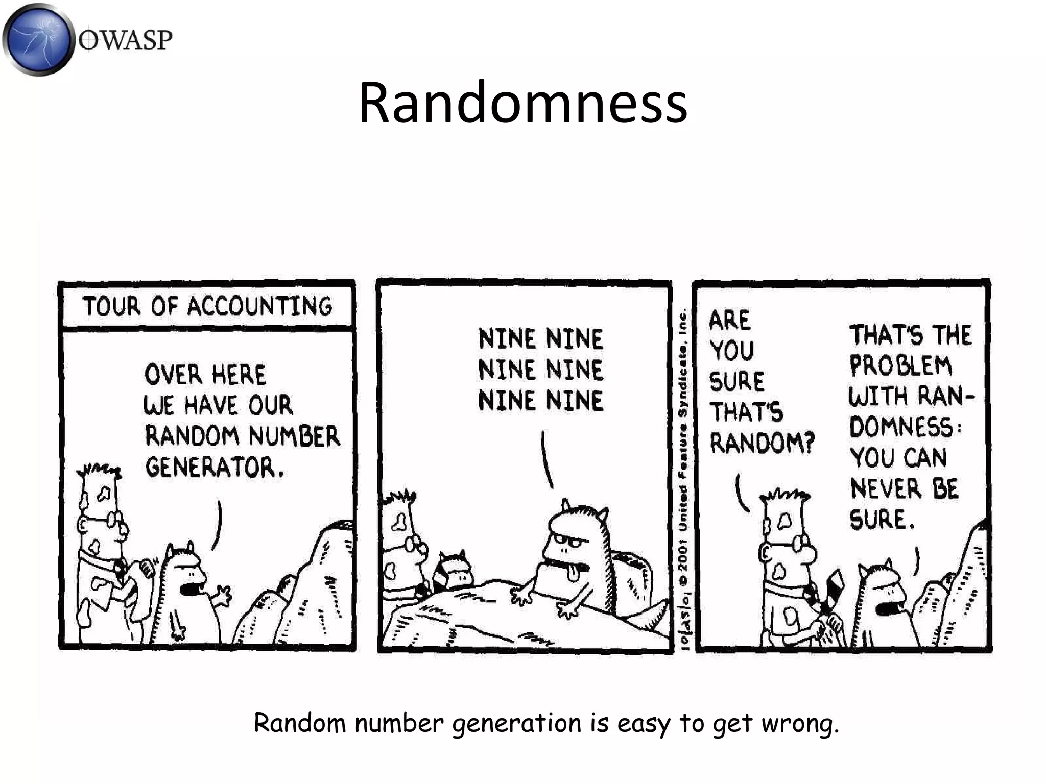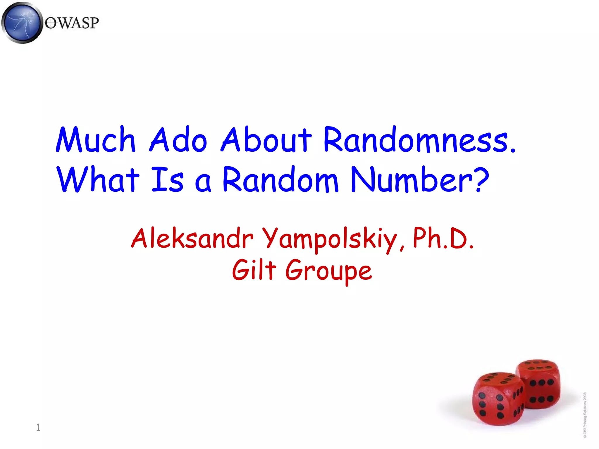 This document discusses randomness and random number generation. It notes that cryptography relies on random numbers, but that generating truly random numbers is difficult. While theory assumes a perfect random source, in practice pseudorandom number generators are used. Several examples are given of systems that used weak random number generation that led to security issues. Lessons discussed include the importance of unpredictable seeds for pseudorandom number generators and using cryptographically secure functions. The document contrasts truly random and pseudorandom number generation, and provides tips for analyzing randomness in programs and web applications.
