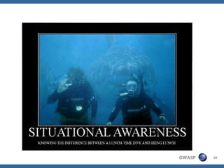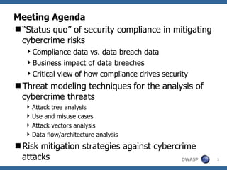 The document discusses the rise of threat analysis and fall of compliance in mitigating web application security risks. It argues that while regulatory compliance aims to improve security, many compliant organizations have still suffered major data breaches. The document advocates applying threat modeling techniques like attack tree analysis to understand likely cybercrime threats and how they could exploit vulnerabilities. This helps identify targeted security measures to implement in applications and architecture.