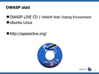 This document summarizes OWASP tools that can be used for testing web applications. It discusses the OWASP Live CD, which contains various tools such as WebScarab, WebGoat, CAL9000 and others. It also mentions OWASP proxies, recon tools, scanners and utilities. The document encourages participation in the Google Summer of Code by proposing ideas and developing student projects to be mentored by OWASP.