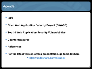This document discusses the top 10 web application security vulnerabilities as identified by OWASP (Open Web Application Security Project). It provides an overview of each vulnerability, examples, and recommendations for countermeasures. The vulnerabilities covered are injection, broken authentication and session management, cross-site scripting (XSS), insecure direct object references, security misconfiguration, sensitive data exposure, missing function level access control, cross-site request forgery (CSRF), using components with known vulnerabilities, and unvalidated redirects and forwards. The document emphasizes using features in Oracle Application Development Framework (ADF) to help address many of these vulnerabilities.