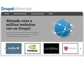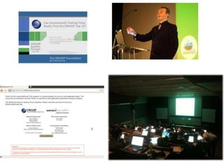 The document discusses securing Drupal against the OWASP Top 10 vulnerabilities. It provides examples of how vulnerabilities like SQL injection, XSS, session hijacking, insecure direct object references, CSRF, misconfiguration issues and failure to restrict URL access could occur in Drupal. It also explains the security measures Drupal has implemented, such as input filtering, form tokens, access control and encryption to address these risks.