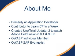 This document discusses using the OWASP Zed Attack Proxy (ZAP) tool to find vulnerabilities in web applications. ZAP is a free and open-source web application penetration testing tool that can be used to conduct both automated and manual testing of applications. The document provides an overview of ZAP's features, how to install and configure it, how to test applications for vulnerabilities using both automated and direct methods, and how to integrate ZAP with other tools.