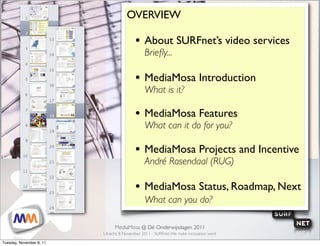 The document discusses MediaMosa, an open source software for building media management and distribution platforms. It can be used to create online video portals and services. The presentation provides an overview of MediaMosa's features, including flexible metadata handling, transcoding services, access management and screening options, and advanced search capabilities. Real-world examples of MediaMosa in use by SURFnet and Kennisnet are also mentioned.