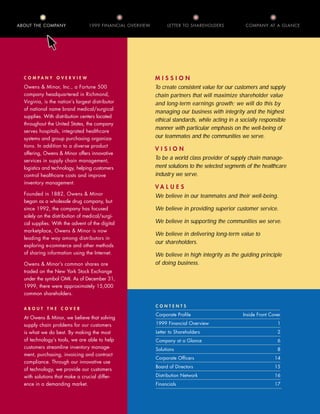 The document discusses Owens & Minor's 1999 annual report. Some key details: - Sales increased 3.4% for the year and 20.1% in the fourth quarter. Net income increased 38.9% for the year. - The company restored its sales volume after losing some business in 1998 and maintained profitability on new business. - For 2000, the company expects to grow revenues 8-10% while maintaining gross margin and lowering expenses to improve earnings by 13-15% or more. - Owens & Minor focuses on operational excellence, converting information to profits through technology solutions, and following patient care trends.