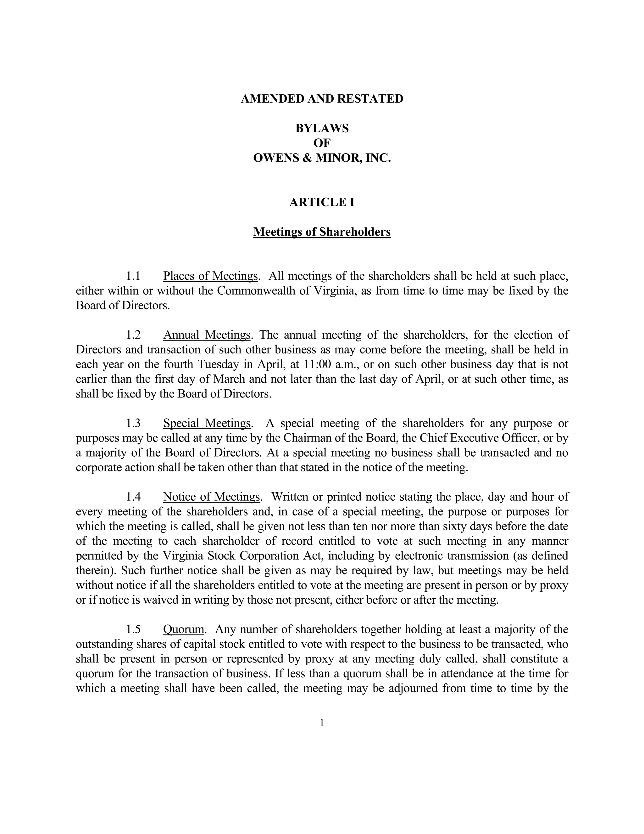 This document outlines the bylaws of Owens & Minor, Inc. regarding meetings of shareholders and the board of directors. It discusses where shareholder and board meetings will take place, how notice will be provided, what constitutes a quorum, voting procedures, and rules regarding nominating directors and proposing other business. It also establishes committees like the executive committee and allows the board to form other committees. Finally, it specifies that the officers will consist of a CEO, President, Secretary, and Treasurer and allows for other officers to be elected.
