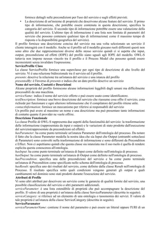 Il documento descrive l'ontologia dei servizi OWL-S, che fornisce una struttura per rappresentare le informazioni sui servizi web attraverso tre componenti principali: profile, process model e grounding. Il profile comunica cosa offre un servizio, il process model illustra come utilizzarlo e il grounding specifica le modalità di interazione. Inoltre, viene espresso che ogni servizio è rappresentato da istanze di classi correlate, assicurando che le informazioni fornite siano coerenti e fruibili dai clienti.