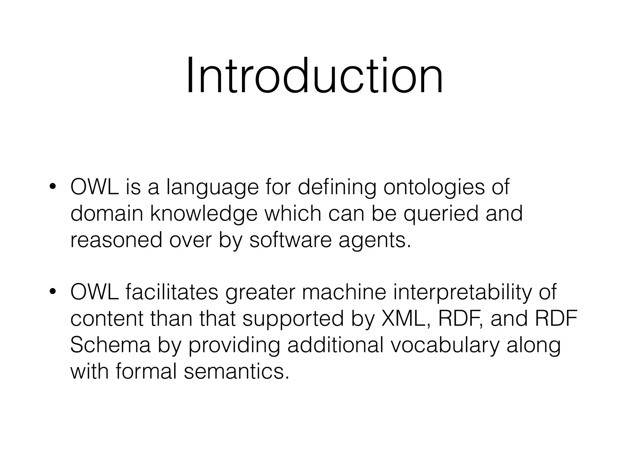 The document provides an overview of the OWL (Web Ontology Language) used for defining ontologies, highlighting its ability to enhance machine interpretability compared to XML and RDF. It outlines the two versions of OWL, the constructs used (such as classes, properties, and individuals), and property characteristics, including various restrictions and syntaxes. Additionally, it offers examples of OWL concepts and encourages the reader to visit the website for further details and resources.