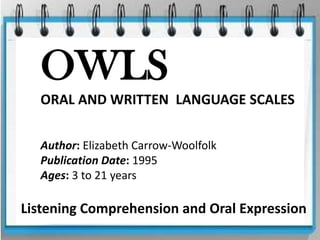 The OWLS measures oral language skills in individuals ages 3 to 21. It assesses listening comprehension and oral expression through tasks measuring lexical, syntactic, and pragmatic abilities. The test is used to identify language disorders and monitor progress. It has good reliability and correlates well with other language and academic measures. Administration is straightforward but the test may not reflect typical classroom language demands.