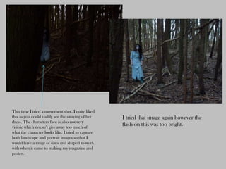The document provides a deconstruction of images taken on the set of a film. It summarizes the photographer's process of experimenting with different camera settings, lighting, character positioning, and focus to capture shots that convey mystery and intrigue. Several photos are highlighted as favorites for a film poster due to how the darkness, hidden character, and unsettling background elements create an eerie atmosphere that will attract and shock audiences. The photographer concludes by selecting one final image as the best choice for the poster based on the character's distance and the trees creating a mysterious effect.