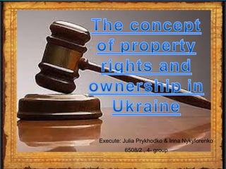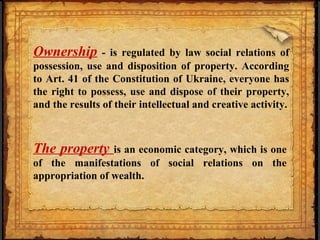 1) Ownership is the right to possess, use, and dispose of property according to Ukrainian law. Ownership can be viewed objectively as the body of law governing property relations or subjectively as the rights and powers of property holders.