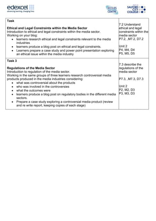 This document provides an assignment brief for an understanding the creative media sector unit. Learners will produce a blog with three posts on the structure and ownership of the media sector, ethical and legal constraints, and regulations. They will research companies and issues, working individually and in groups. The tasks are assessed based on criteria for understanding the media sector and communication skills.