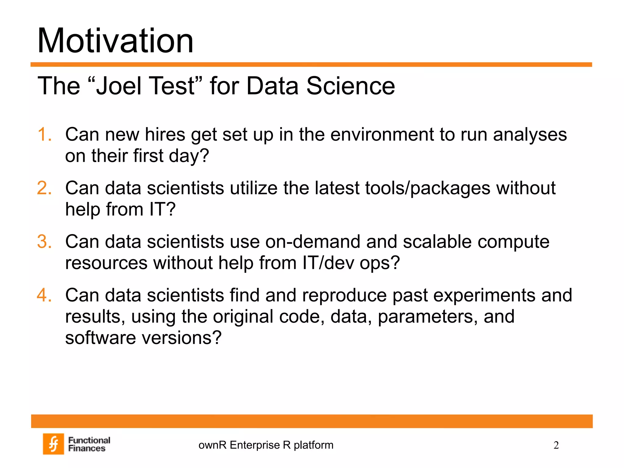 The document outlines the Ownr Enterprise R platform, detailing its capabilities in enabling data scientists to efficiently conduct analyses from day one, utilize advanced tools, and manage resources without IT assistance. It emphasizes the importance of collaboration, reproducibility of experiments, and streamlined deployment of predictive models. The platform supports secure and scalable access to R and Python applications, ensuring comprehensive tools and resources for effective data science workflows.