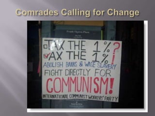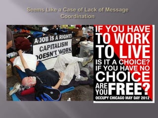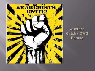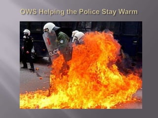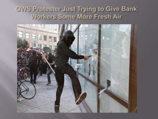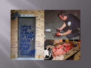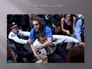 The document discusses the Occupy Wall Street movement through pictures, including a protester continuing her mother's legacy of activism and guidelines for protesters such as not urinating, vomiting, or defecating in public. It also provides links to a story and running tally of confirmed arrests and citations related to Occupy protests.