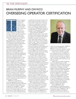 OWWCO oversees operator certification in Ontario, administering exams, processing applications and renewals. There are approximately 10,000 operators, with 4,300 receiving new certificates and 4,500 renewing annually. Operators start as OITs, and can upgrade to Level 1 with experience. Higher levels require more experience, education, and hours as operator-in-charge. OWWCO works closely with the MOECC and operators to continuously improve the certification program.