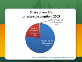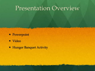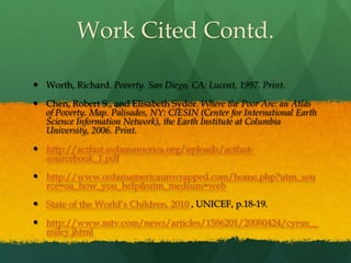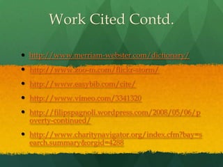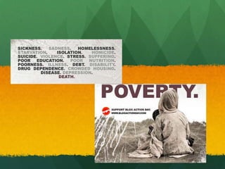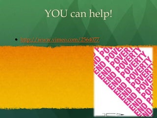 Helping the Poverty Stricken is a presentation about Oxfam America and global poverty. It discusses how Oxfam works to end poverty through saving lives, strengthening communities, and advocating for policy change. The presentation also examines the various causes and consequences of poverty, such as lack of access to food, water, healthcare, and education. It encourages students to support Oxfam through donations, fundraising, volunteering, or spreading awareness of the organization's mission.