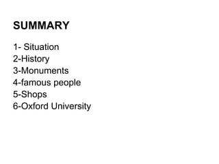 Oxford is a city in central England known for its historic architecture, including the Bridge of Sighs and Carfax Tower, and as the home of Oxford University, one of the world's most prestigious universities. Famous people who attended Oxford include Stephen Hawking and Bill Clinton. The local economy benefits from the university as well as industries like publishing and technology firms. Broad Street, the Covered Market, and Templars Square are popular places for shopping and exploring Oxford's bookstores, shops, and history.