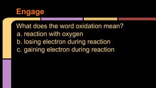 The document explains oxidation as a chemical reaction process involving the loss of electrons, particularly in reactions with oxygen. It outlines oxidation number rules and provides examples of how to determine oxidation states in compounds and ions. Additionally, it discusses redox reactions, which involve the gain and loss of electrons, and their significance in biological processes like photosynthesis and cellular respiration.