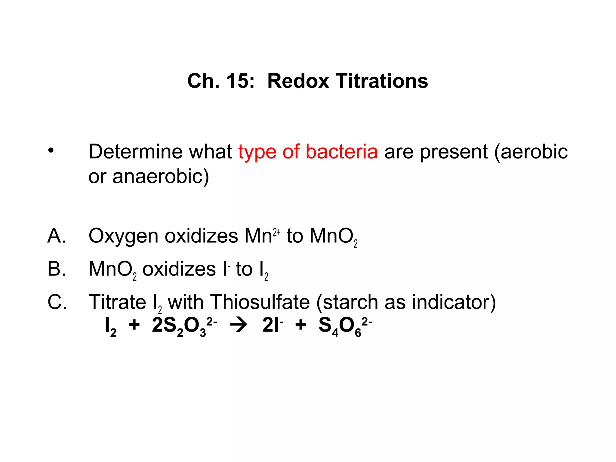 This document discusses redox titration methods. It describes the Winkler method for determining dissolved oxygen in waste water and determining whether bacteria present are aerobic or anaerobic. The Karl Fischer method for determining water content is also outlined, using iodine, sulfur dioxide, and pyridine dissolved in methanol to quantitatively reduce iodine in the presence of water. Common oxidizing agents used in redox titrations include potassium permanganate, potassium bromate, cerium(IV), and potassium dichromate. Sodium thiosulfate is also described as a moderately strong standard reducing agent often used in indirect iodometric titrations to determine oxidizing agents.