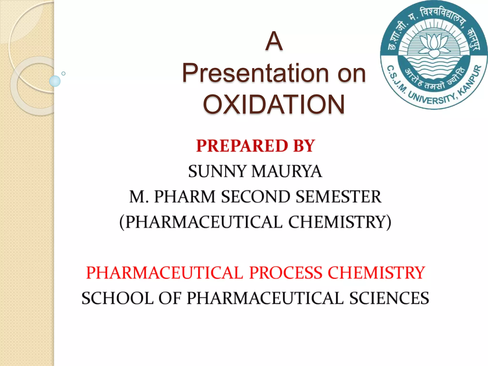 This presentation discusses oxidation reactions and various oxidizing agents. It defines oxidation as the gain of oxygen or loss of electrons by a molecule. The main types of oxidation discussed are dehydrogenation, peroxidation, and introduction of oxygen atoms. Liquid phase oxidation using oxidizing agents like hydrogen peroxide, sodium hypochlorite, and oxygen gas are also covered. Specific examples of oxidizing organic compounds like aniline and furfural with different agents are provided. Key oxidizing agents like hydrogen peroxide, sodium hypochlorite, and oxygen gas are described in more detail including their structures, production methods, decomposition reactions, and common applications.