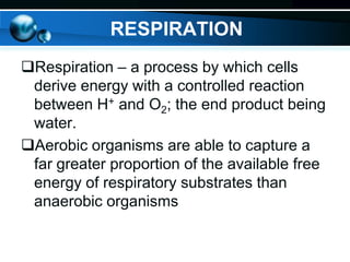The document provides information on cellular respiration and how it generates ATP through oxidative phosphorylation in the mitochondria. It discusses the electron transport chain, made up of protein complexes I-IV in the inner mitochondrial membrane, which establishes a proton gradient by pumping protons from the matrix to the intermembrane space. This proton gradient drives ATP synthase to catalyze the phosphorylation of ADP to ATP. The chemiosmotic theory explains how the potential energy in the proton gradient is used to produce ATP through rotation of the ATP synthase complex.