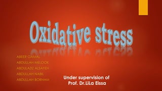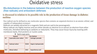 The document discusses oxidative stress and reactive oxygen species (ROS). It defines ROS and lists some examples like superoxide anion radical, hydroxyl radical, and hydrogen peroxide. It describes how ROS are produced endogenously through processes like mitochondrial electron transport, and exogenously through factors like pollution, radiation, and xenobiotics. The effects of ROS include DNA damage and modulation of signal transduction pathways. It also discusses antioxidants, dividing them into antioxidant enzymes like superoxide dismutase and catalase, chain breaking antioxidants like vitamins C and E, and transition metal binding proteins.