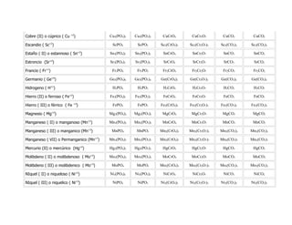 The document lists the chemical compounds that are formed from reactions between various cations and anions. It shows the phosphate, phosphite, chromate, dichromate, carbonate, and carbonite compounds of over 50 different cations, including metals, nonmetals, metalloids and protons. Each cation can form distinct compounds depending on whether it reacts with phosphate, phosphite, chromate, dichromate, carbonate or carbonite anions.