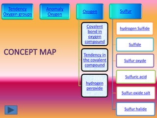 The document discusses various oxygen and sulfur compounds. It describes the characteristics of common oxygen groups like oxygen, ozone, hydrogen peroxide and their bonding structures. It also discusses the properties of sulfur and sulfur compounds such as hydrogen sulfide, sulfides, sulfur oxides, sulfuric acid, sulfur salts and sulfur halides. The document provides information on the tendencies and bonding preferences in these oxygen and sulfur compounds.