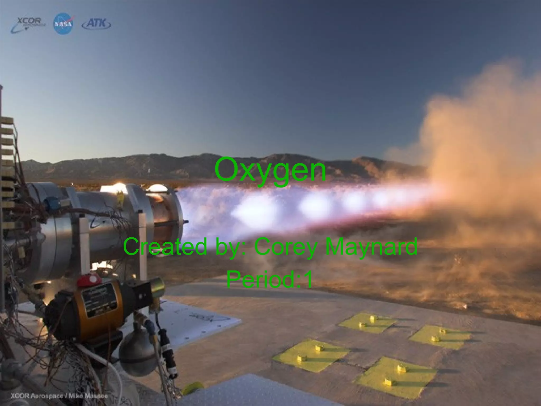 Oxygen is a non-metallic element that is colorless, odorless and tasteless. It has an atomic number of 8 and constitutes 21% of the Earth's atmosphere. Oxygen is vital for animal and plant respiration and is found in water and used in combustion processes. Liquid oxygen is pale blue and has a boiling point of -183°C. It is used as a source of breathing in aircraft and rockets and as an oxidizer in rocket fuels.