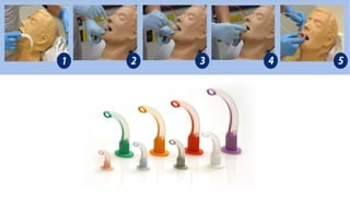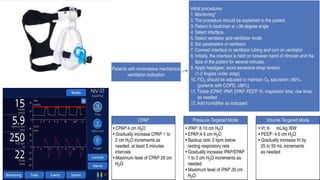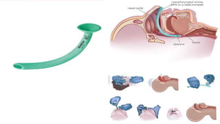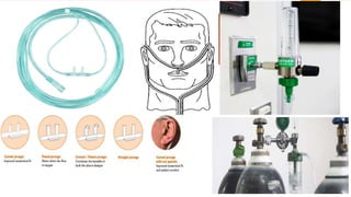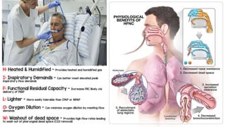 This document discusses various methods of oxygen therapy including nasal prongs, simple face masks, non-rebreathing masks, high flow nasal cannulas, non-invasive ventilation, airway adjuncts, invasive ventilation, and sedation. It covers the physiology of oxygen therapy and preparation needed for different ventilation methods.
