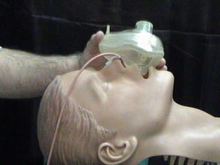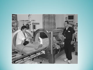 Oxygen therapy involves administering oxygen at concentrations greater than 21% to treat or prevent hypoxia. The two main types are orthobaric oxygen therapy, which delivers increased oxygen at ambient pressure, and hyperbaric oxygen therapy, which delivers high oxygen concentrations at increased atmospheric pressure. Orthobaric devices include nasal cannulas, face masks, and venturi masks which can provide fractional inspired oxygen concentrations from 24% to 60% depending on the device and oxygen flow rate. Hyperbaric oxygen therapy is used to treat certain infections, acute injuries, and non-healing wounds by exposing the patient to 100% oxygen at pressures usually between 2 and 3 atmospheres absolute. Potential side effects of oxygen therapy include respiratory issues, central