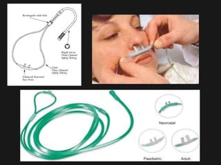 2. It describes different methods of oxygen administration including nasal catheters, oxygen masks, nasal cannulas, oxygen tents, and transtracheal oxygen.