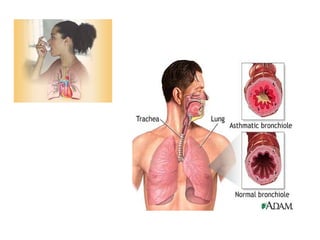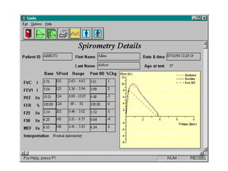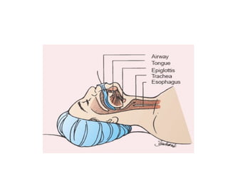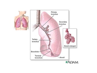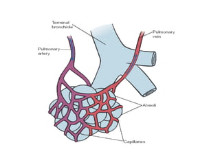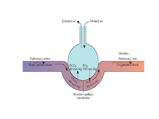 Ventilation of the lungs occurs through breathing, which requires clear airways, an intact respiratory system, and a thoracic cavity capable of expanding and contracting. Oxygen diffuses from the alveoli into the blood while carbon dioxide diffuses from the blood into the alveoli. Factors like cardiac output, hematocrit levels, and exercise affect oxygen transport. Respiratory regulation maintains appropriate oxygen and carbon dioxide levels through neural and chemical controls. Alterations in respiratory function include hypoxia, hypoventilation, and hyperventilation which have signs and symptoms like anxiety, fatigue, and cyanosis.