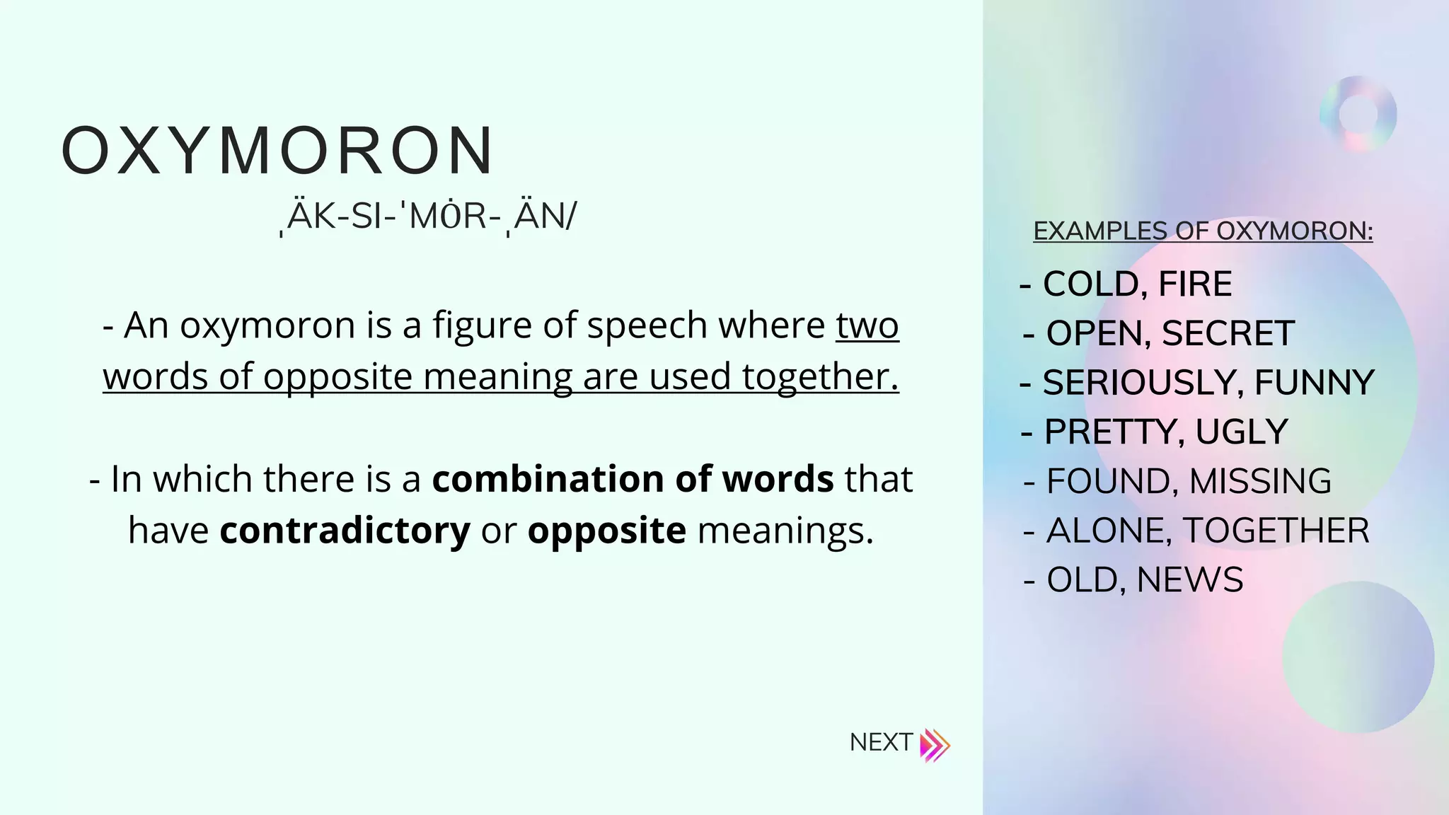 An oxymoron is a figure of speech that uses two contradictory terms together, such as "cold fire", "open secret", "seriously funny", "pretty ugly", "found missing", "alone together", and "old news". It combines words that have opposite meanings.
