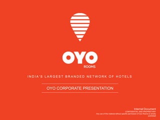 This document provides an overview of OYO Rooms, India's largest branded hotel network. It discusses OYO's rapid growth from 11 rooms in 2013 to over 30,000 rooms across 150 cities. OYO transforms unbranded hotels into consistent, high-quality accommodations through technology, services, and standardized amenities. The presentation outlines OYO's business model, categories of hotels, partnerships with travel agents and corporates, and management team. It promotes the benefits of partnering with OYO to property owners.