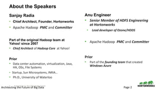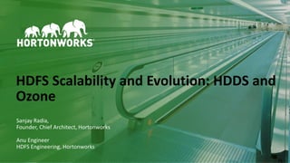 The document discusses scaling challenges with HDFS and proposed solutions from Hortonworks called HDDS and Ozone. HDFS scales well for data and IO but has limitations scaling the namespace beyond 500 million files. HDDS aims to scale the block layer using block containers which can reduce block reports. Ozone uses a flat key-value namespace that is easier to shard and scale beyond billions of objects compared to HDFS hierarchical namespace. It also provides an HDFS compatible filesystem called OzoneFS. Together HDDS and Ozone aim to retain HDFS features while scaling to exabytes of data and trillions of files.