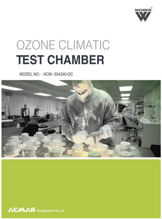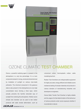 The document describes an ozone climatic test chamber manufactured by Technocracy Pvt. Ltd. The test chamber can be used to test rubber and plastic products by simulating high ozone concentration levels along with temperature and humidity settings to evaluate the products' resistance to ozone degradation over time. Key features include a temperature range of 0-70°C, humidity of at least 65% RH, and adjustable ozone density of 50-1000pphm. The chamber uses imported components and meets various industry and regulatory standards.