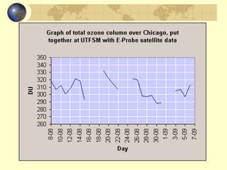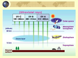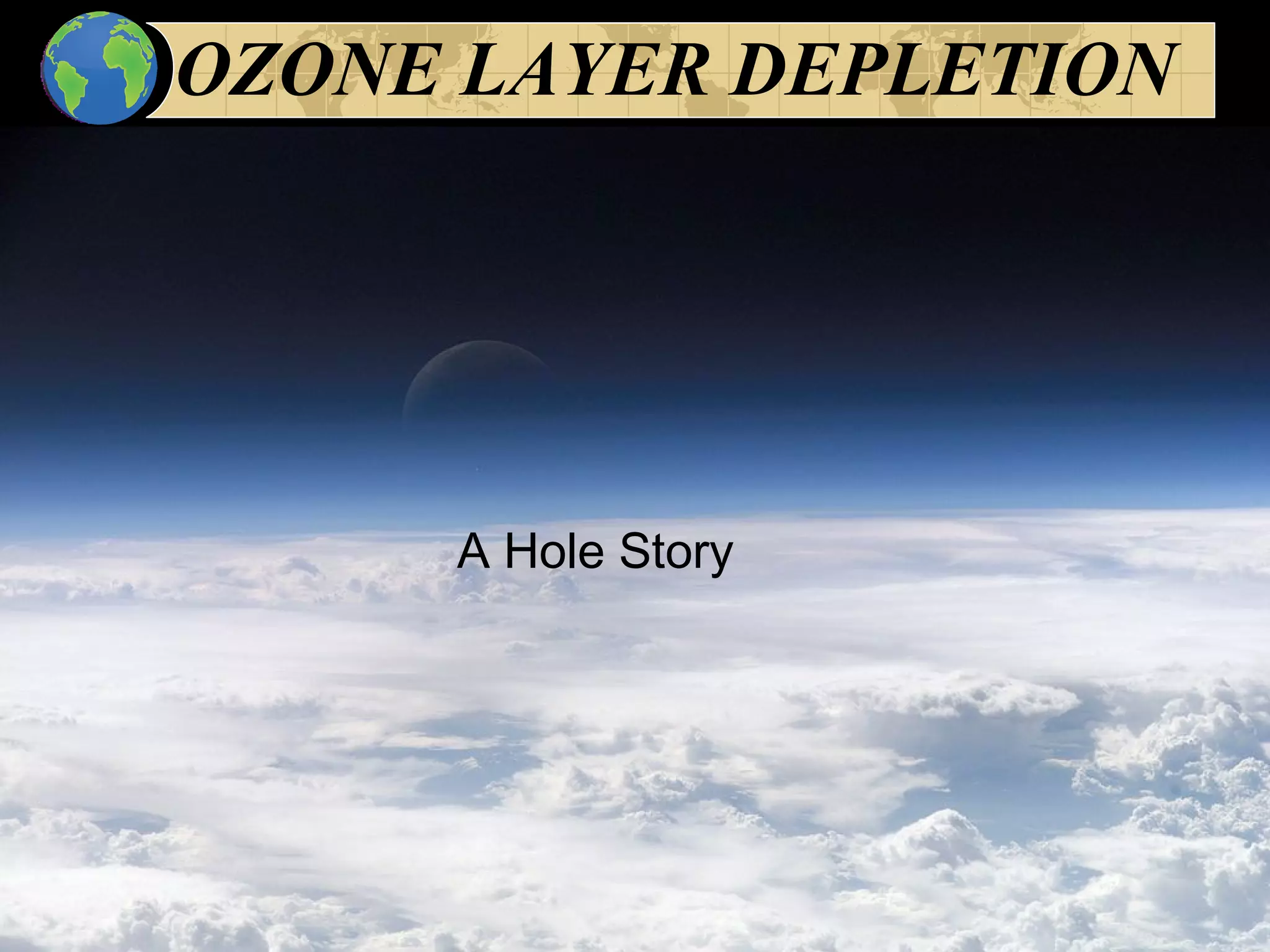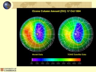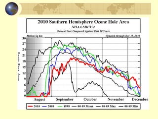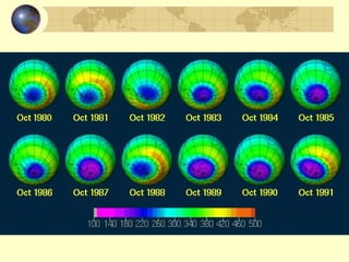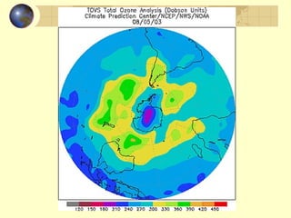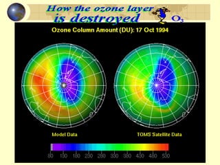 The document discusses ozone layer depletion and the formation of holes in the ozone layer over Antarctica. It describes how ultraviolet radiation breaks apart DNA and ozone absorbs UV light. Chlorofluorocarbons (CFCs) were found to catalyze the destruction of ozone through a series of reactions. Strong winds isolate air over Antarctica in winter, allowing ice clouds and CFC reactions to deplete ozone and form holes that grow larger each year. International agreements have led to a ban on CFCs to help the ozone layer recover.