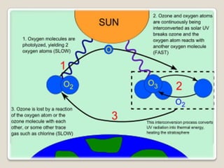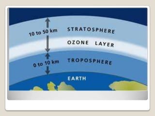 The ozone layer is a layer in the Earth's atmosphere that contains relatively high concentrations of ozone. It was discovered in 1913 and protects life on Earth by absorbing harmful ultraviolet radiation from the sun. Depletion of the ozone layer is caused by chemicals like chlorofluorocarbons that were used in aerosol sprays and refrigerants until their ban in the late 1970s. Ozone depletion increases UV radiation at the surface of the Earth and can potentially damage skin, eyes, and suppress immune systems.