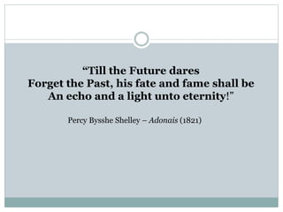 This document provides background information on the poet Percy Bysshe Shelley and analyzes his famous poem "Ozymandias." The poem tells of a traveler who comes upon a statue in the desert of a king, Ozymandias, with an inscription boasting of his great works and power. However, only the statue's legs and shattered face remain, showing how time destroys all earthly achievements. The document discusses Shelley's life, literary influences, and analyzes elements of the poem like its form, figures of speech, themes of pride and the relationship between man and nature.