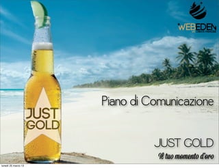 Il documento presenta un piano di comunicazione per il prodotto Just Gold, un marchio di birra, analizzando il contesto di mercato, i concorrenti e il target di riferimento. Vengono delineate strategie di comunicazione mirate a incrementare la consapevolezza del brand e posizionarlo come scelta per momenti di relax e socializzazione. Le attività previste includono eventi, campagne sui social media e collaborazioni con locali, con un focus specifico su giovani adulti e professionisti.