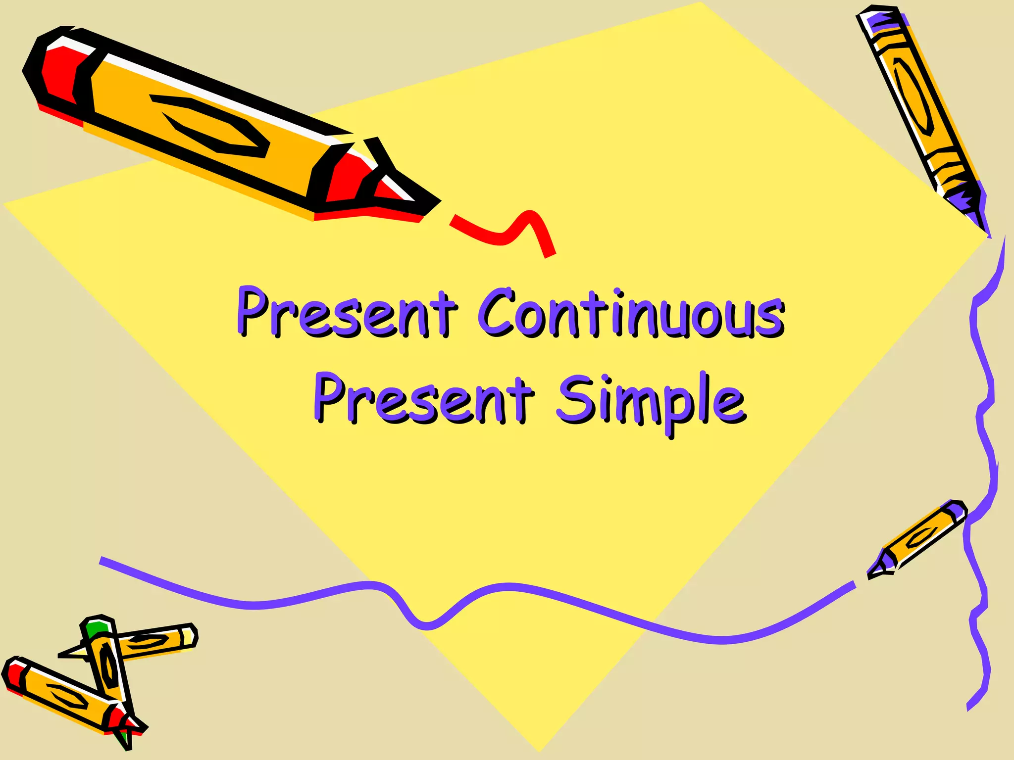 The document contrasts the present continuous and present simple tenses in English. It provides examples of how each is used, including for ongoing or habitual actions. The present continuous is used for actions happening now or over a period of time. The present simple is used for repeated or habitual actions, as well as universal truths. Formations of both tenses are also demonstrated for the first, second, and third person singular and plural.
