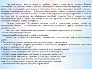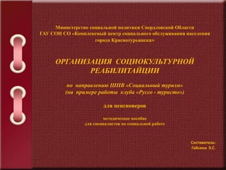 Документ представляет методическое пособие для специалистов по социальной работе, касающееся организации социокультурной реабилитации пенсионеров через социальный туризм на примере клуба «Руссо-Туристо». Основные цели программы включают социальную адаптацию участников и развитие их реабилитационной культуры, а также организацию экскурсионных поездок, которые помогут пенсионерам улучшить психологическое состояние и расширить кругозор. Пособие описывает различные формы социального и культурного туризма, нацеленные на удовлетворение потребностей пожилых людей в активном отдыхе и ознакомлении с местной культурой и историей.